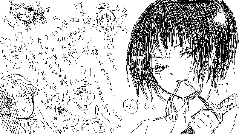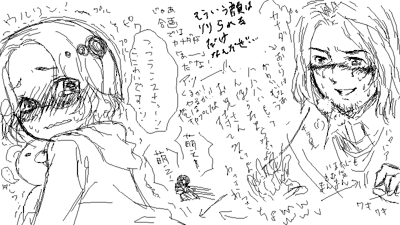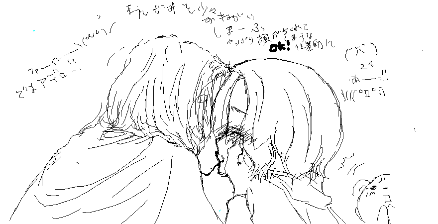 と、ここでそろそろいちょいちょ絵を描こうではないかということになりまして 仏兄ちゃんの頭前半部分まで描いてたらちゃっぴい、まさかのペンタブ動作不良…(涙) 二人ともやるせなさを抱えたまま強制的におひらきとなりました…うぅ… (その後ペンタブの調子を整えて再び絵チャ室に入ってみたらログが残ってたので仕上げた) (あとキャンバスもちょっと広くした) 「仏兄はキスが上手いから加は腰砕けになるだろうよ!」という若蛇のナイスアイディアにより うまれた一枚。うぶな子がお兄さんに翻弄されるというのは実に良いものだ…(恍惚) |